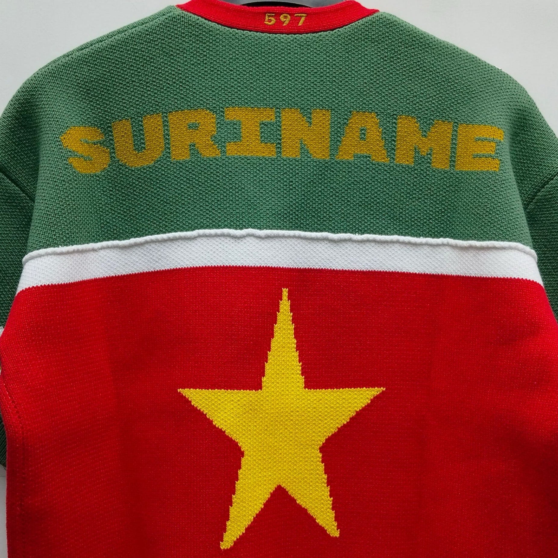 ✅ Geweven materiaal, lichte stretch. Zwaar en kwaliteit! Verschillende accenten zoals: De 597 in het goud achter in de nek en de geborduurde Surinaamse vlag.